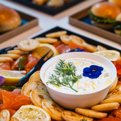 Craquez pour notre plateau de saumon fumé à partager, accompagné de savoureux blinis et d'une crème onctueuse à l'aneth.
